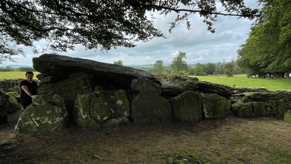 Next we head for Labbacallee wedge tomb. This appears on the side of the road outside someone’s garden! Miriam reads the guide book and tells me that a wedge tomb differs from a portal tomb because of the long slant of the stones and also the timing. This is about 2,000 years BC whereas the portal tombs are even older!