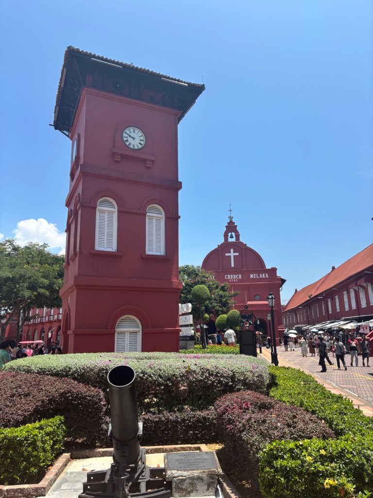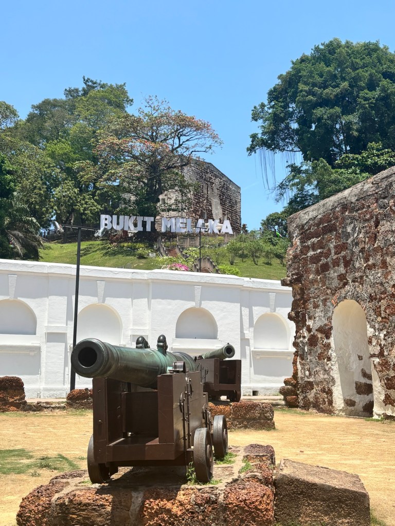 We walk around the remains of Melaka fort and then climb Bukit Melaka or Melaka hill. It’s very hot so it’s sweaty business but the views are worth it.