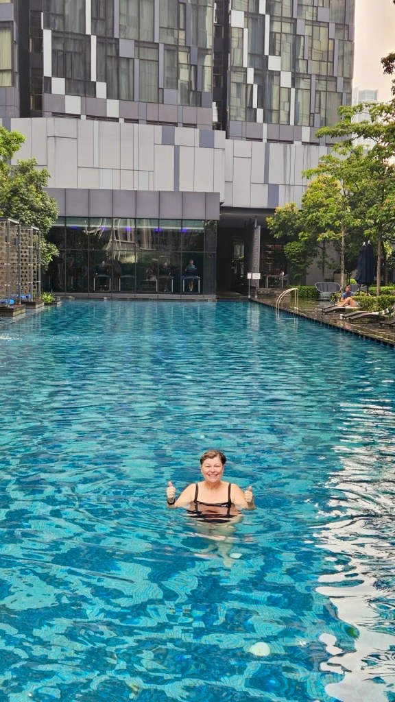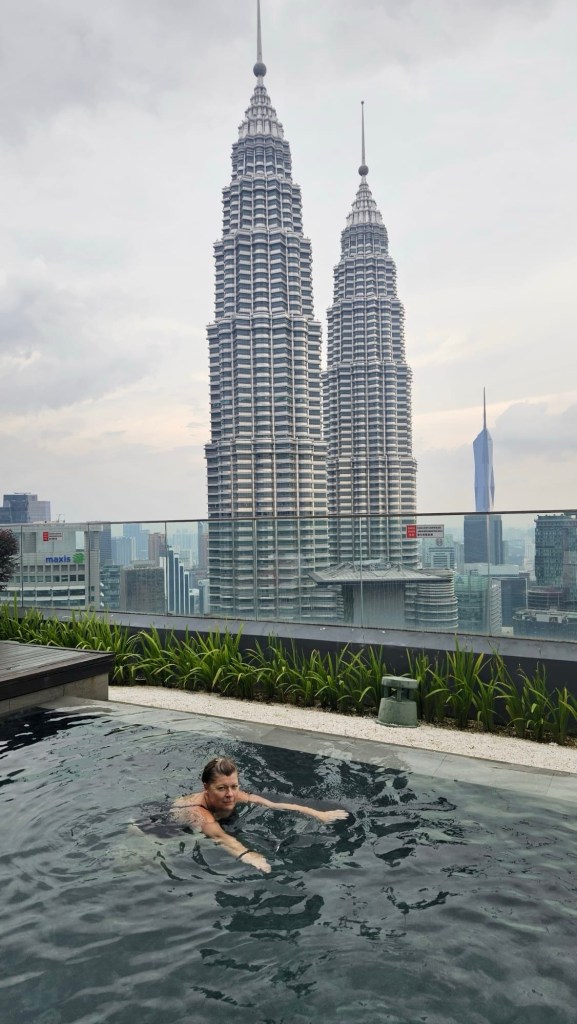 A bit worn out from all the walking in the heat, we head back and go for a swim on the top floor of the building. I’m loving it with a view of the Petronas Towers.