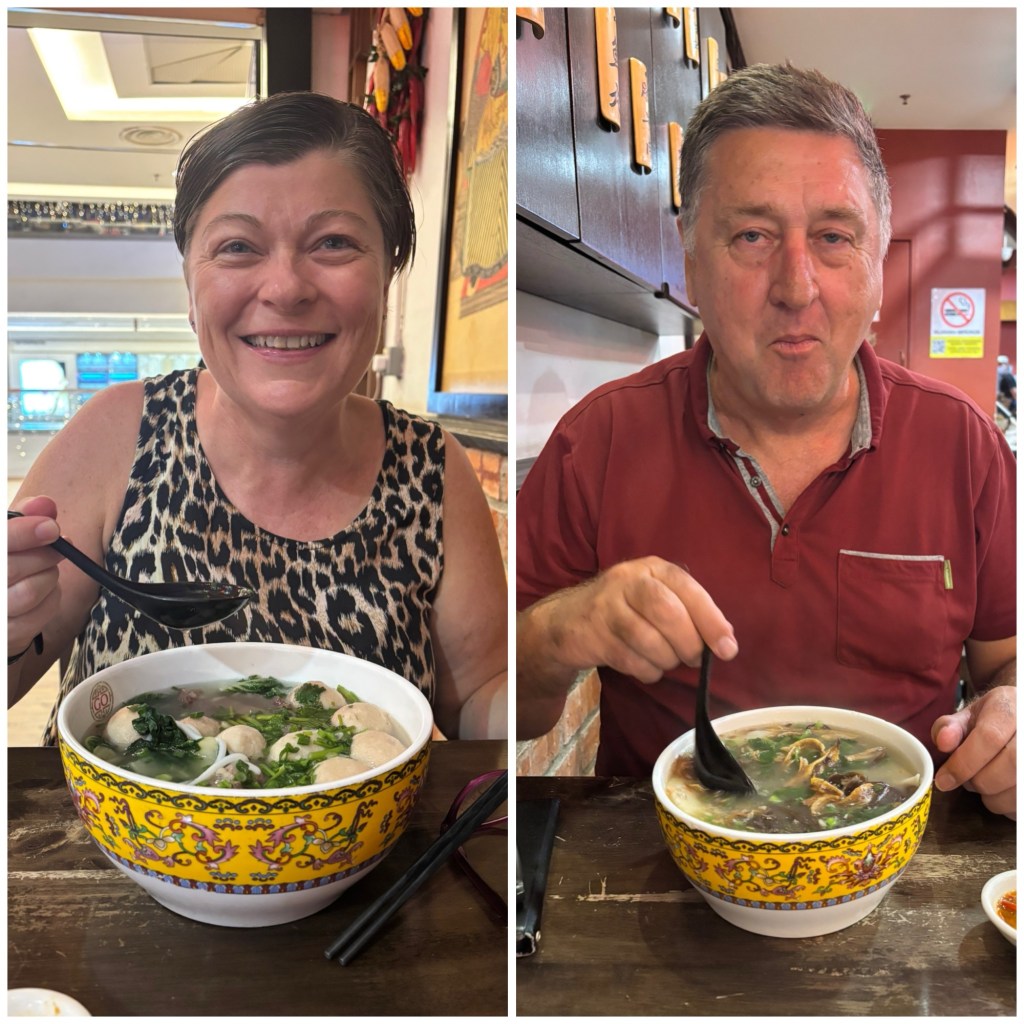 This evening we go for dinner in a Chinese restaurant in the huge shopping mall beside us. Shane does the online order at the table and somehow manages to order me an XL dish while his is regular!!! Mine has “exploding pork and beef balls” and they are fantastic … and yes of course I share!!
