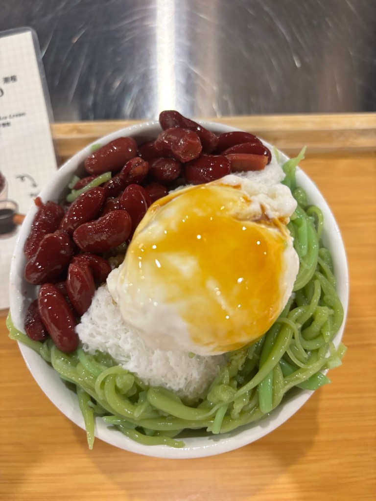 Cendol, which you find all over Malaysia has been on our list to try since we got here but we haven’t managed to have one… well until now that is. It’s a traditional dessert of shaved ice topped with soft, green, worm-like jelly strands made of rice flour, coconut ice cream, palm sugar and in the case of this one, kidney beans!!! It’s not very sweet considering it’s a desert – worth trying once I reckon!
