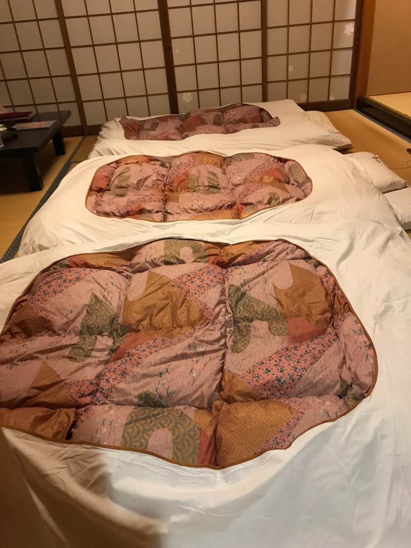 We are able to order beer which we are delighted with. We did smuggle in some wine just in case but we might need that later on the hike! While we’re eating dinner someone is moving the table from the middle of our room and laying out the futons. This is what we’ll be sleeping on for our time in the mountains: