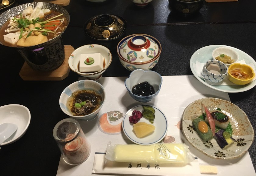 Back at our temple lodging it’s time for dinner. The food is beautifully presented but it’s vegan (seriously!) and essentially tofu prepared six different ways with very limited flavors. I’m all on for trying new things but it’s bland and tasteless – I eat most of it mind you!!