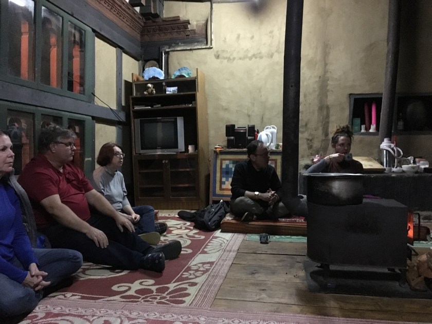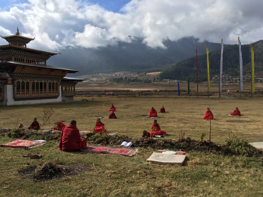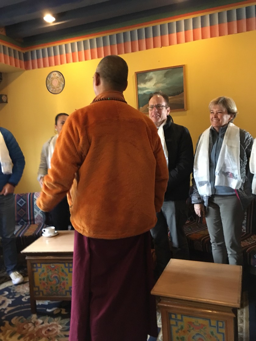 After a hearty breakfast we had a meeting with a monk! This is apparently an exclusive offered by this tour and it was a great experience. Kenpo Phuntsho Tashi was just lovely. He was praying as we entered one by one and handed him a white scarf that he then placed around our necks. We sat in seats around him and he started by teaching us some basic meditation. He explained that there are seven postures to follow which include how to place your feet, hands and tongue. From there you concentrate on your breathing where you breath out for longer each time. He told us that as beginners you should only meditate for one minute a day but try do it 10 times a day and build it up gradually. He said there are so many distractions that if you tried to meditate for a long period of time you’d get bored or just fall asleep!! He was very lighthearted about the whole thing but talked about how important meditation is not only for yourself as an individual but also to help bring peace to the world around us. While meditating you should repeat “I am a lotus flower blossoming for the world” – I thought that was lovely.