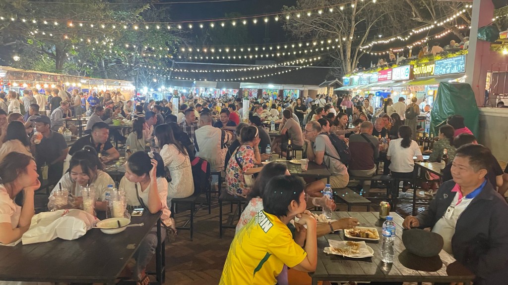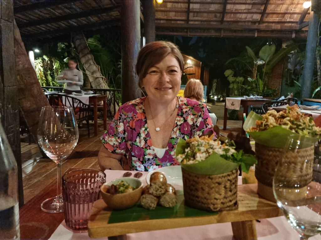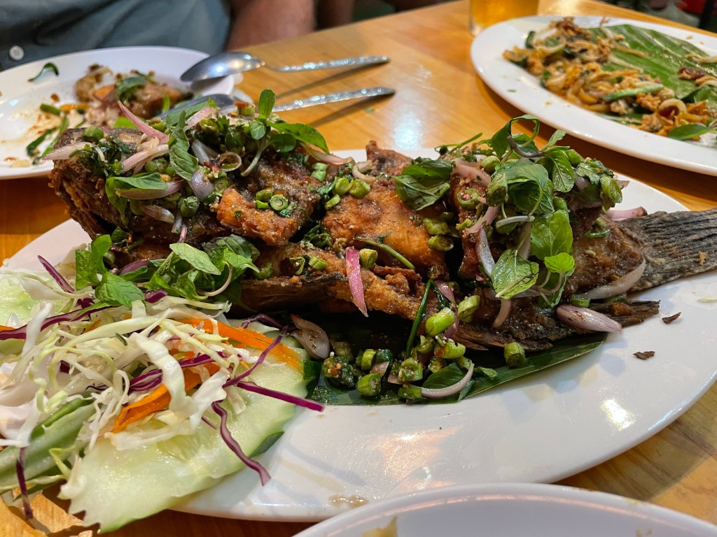 On the way back through the busy night market there’s an exercise class happening. We head to Sticky Fingers for a cocktail while we figure out what our final meal will be. On the way to the restaurant we’ve settled on, we pass a very casual eatery on the side of the street which has Mekong fish on the grill. We are tempted to stop but keep going….. alas the restaurant we’re heading to is not there, it must have closed down so we head back to the locals type establishment and have a gorgeous final dinner of grilled Mekong fish, pig intestines (they were actually quite tasty, chewy!), fried rice with shrimp, stir fried pork with basil and some bonus soup! An amazing final meal.