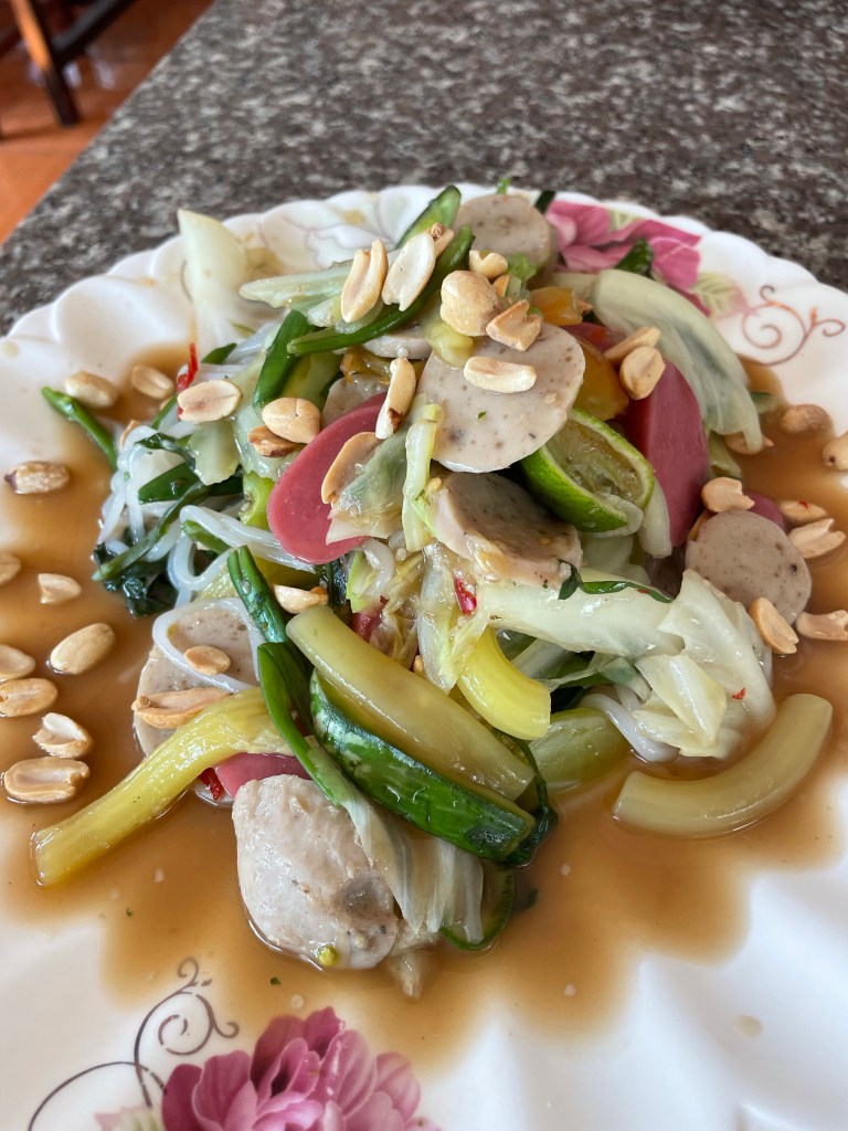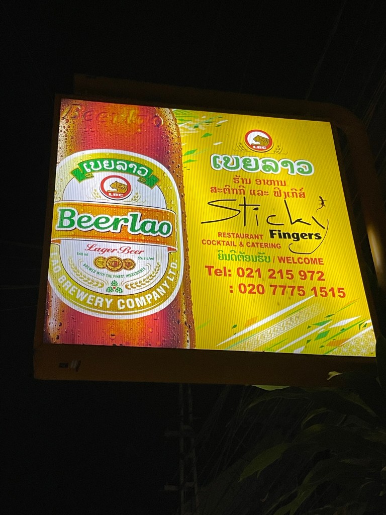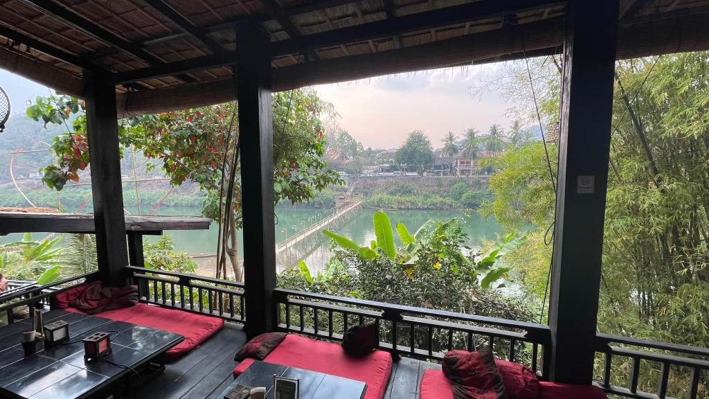 We spotted a restaurant we like the look of around the corner so head there for our final Laos meal. As ever we are delighted with the feast. We have sausage, laab (the minced pork salad), fried rice with shrimp and some stir fry vegetables – they really do veggies well in this town.