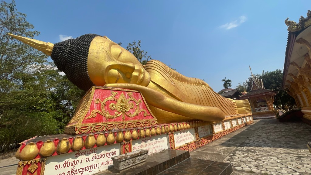 We head back to our tuk tuk driver who’s waiting for us and realise there’s another section of temples and Buddhas I take a quick peek in and am delighted that there’s a large golden reclining Buddha (lazy Buddha as someone I know calls him!).