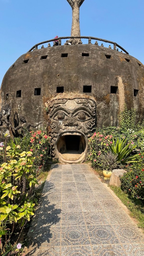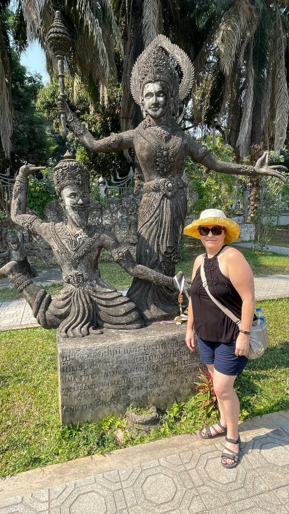 We’re up and out early next morning in an attempt to catch the cooler part of the day. It doesn’t feel much cooler to me. It’s still about 30 degrees. The sky is hazy as we take a forty minute tuk tuk ride to Buddha park.