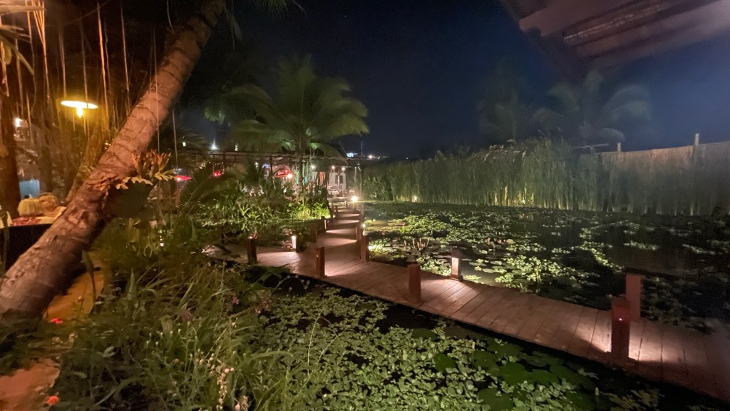 We do a loop and walk as far as the bamboo bridge. It’s pretty to see it at night with the lights.