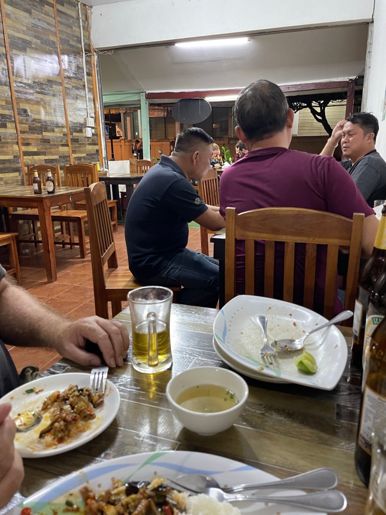 We decide to eat at a small place close to our hotel. It’s full when we arrive but there is one table that we happily grab. Beside us are three men, with a fourth standing but drinking Beerlao with them. He also seems to be taking orders and delivering food. He’s mad to chat to Shane, wants to know where he’s from and clink glasses for cheers, santé and I tell him slainte! We have a great chat and giggle with him. He tells us he’s working putting in electric wiring and he has two little kids. His name is Ling. Every few minutes he cheers again, we are having great craic. There seems to be quite a rush on in the kitchen and I think a couple of tables are getting a bit impatient for their food. We’re grand as we’re on the beerlao. Ling decides to give Shane a plate of cucumber with soy sauce on it.. he says that’s how they eat it in Laos. It’s actually very nice, I might have cucumber like this all the time at home.