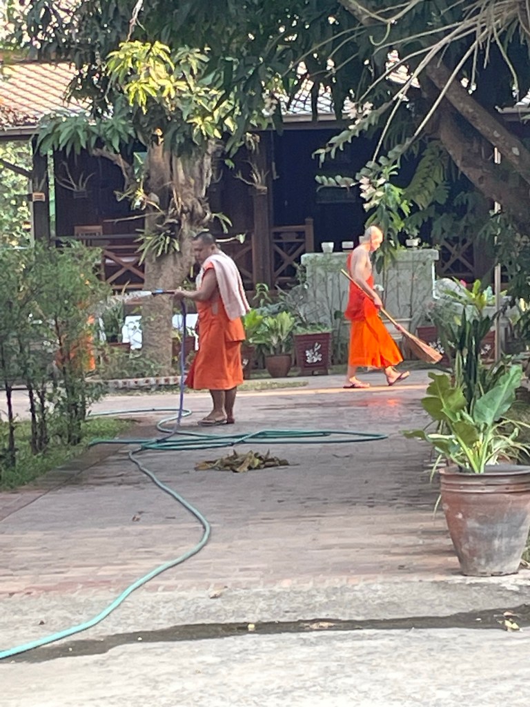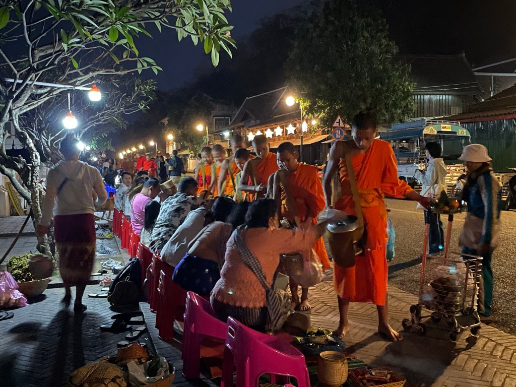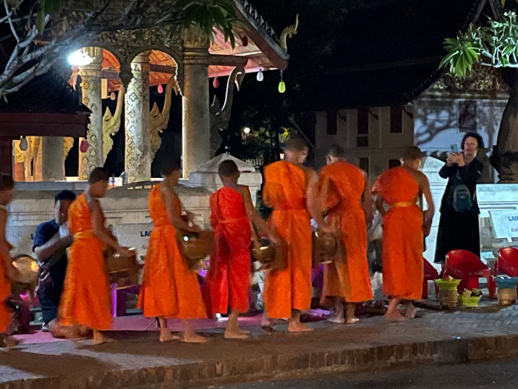 We see tourists line the streets sitting on tiny plastic chairs with food ready to give to the monks. Sellers are everywhere ready to sell you more alms. Then the monks arrive, always in silence and in a steady row. We see their bowls overflowing but they continue to accept the alms offered. But having just received alms, from the tourists lining the streets, they drop them into a large open basket at the end of the row of chairs. It looks like people are selling tourists food to give to the monks and then the monks give it back to the them… hmmm maybe the baskets are for poor people who the monks share their food with… I’m generally not cynical about these things so I really hope I’m right that they’re giving away the alms to the poor.