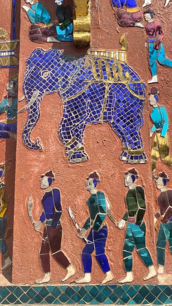 Time for the last temple of the day. It’s close by our hotel but we haven’t managed a visit yet. The name in the guidebook is different to the name on Google which is different again to what it says outside the building. We’ll go with Wat Ong Teu. It has a beautiful vibrantly coloured entrance.