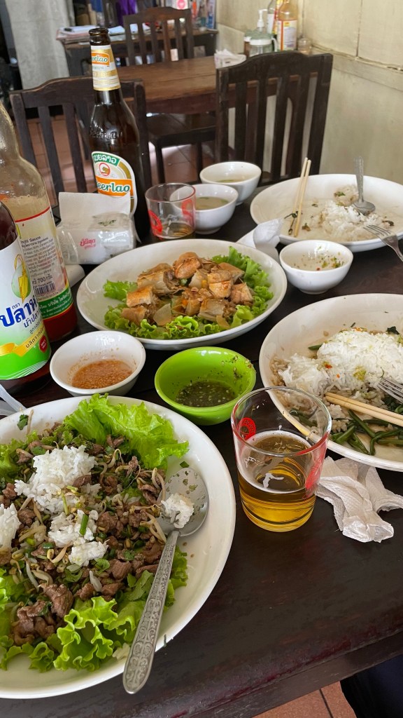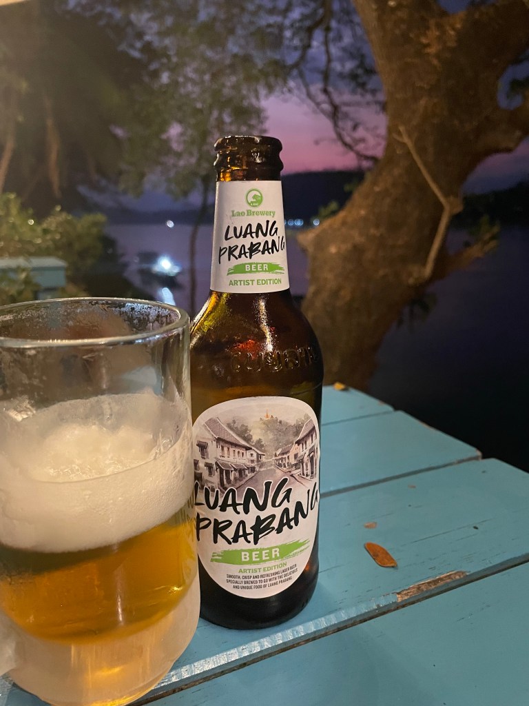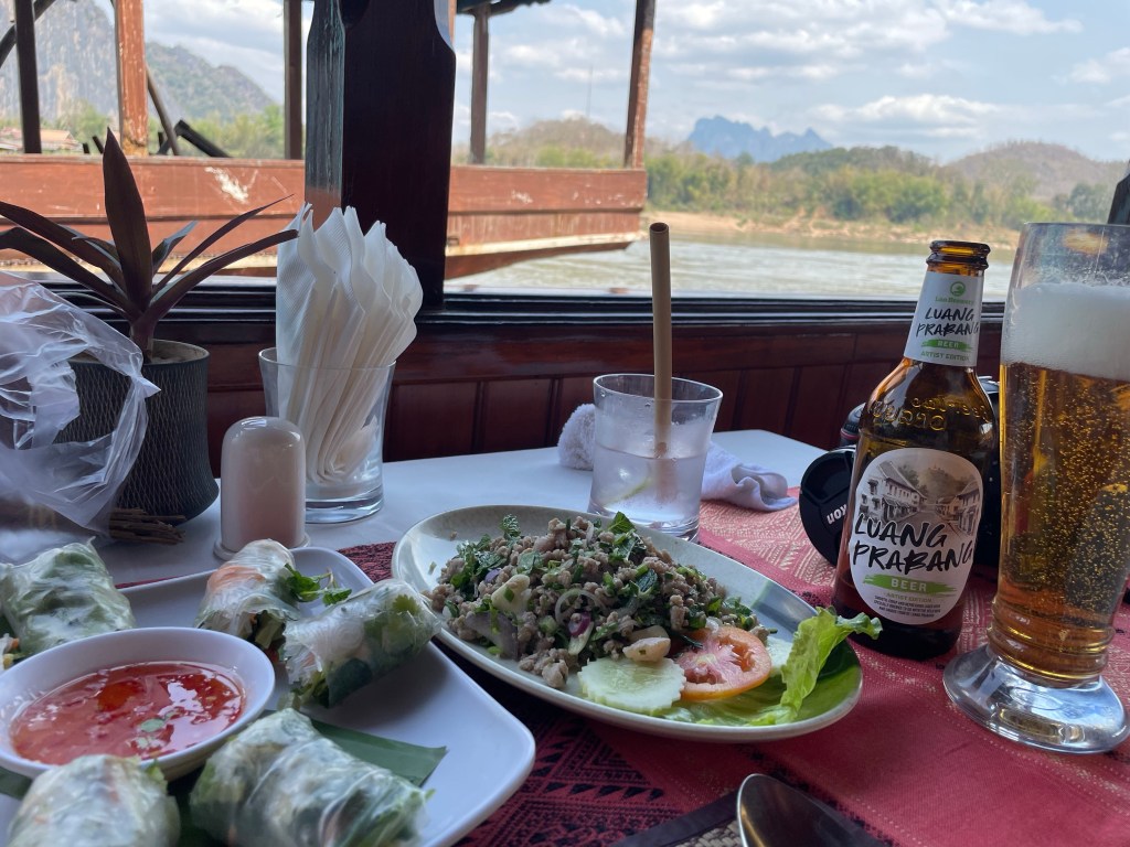 Back on the boat they’re ready to serve us lunch – it’s really good… more local Laos food and we love it. We have a local Luang Prabang beer because why not!