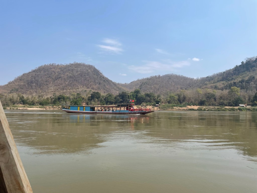 Our boat is called the Nava Mekong and there are just two other couples onboard – one German, who barely say hello and the other English, who we have a great chat with. [They booked a trip travelling through Southeast Asia with Trailfinders and while loving it, they are exhausted as they’re packing all of the tourist stuff in and they are constantly with a guide – they look wrecked God love them]. It’s really relaxing and we sit upfront until the sun gets too hot and then move inside where there is some shade.