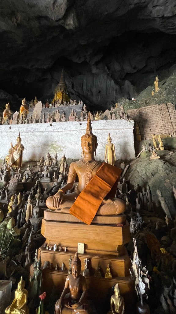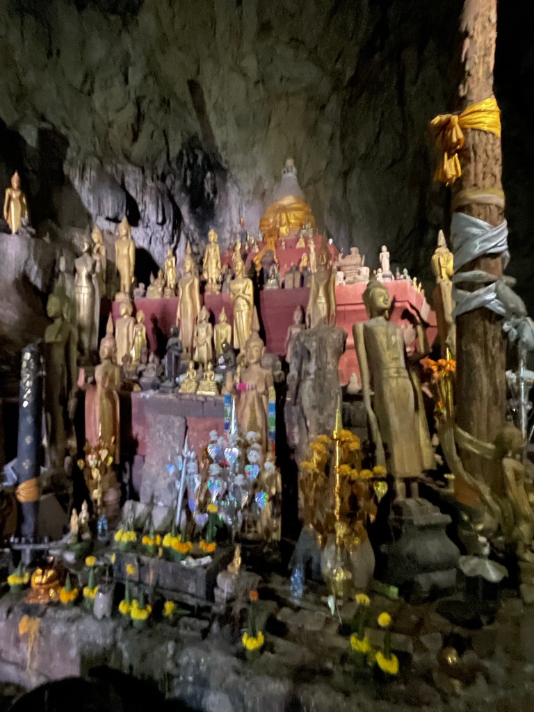 Next we visit the Pak Ou caves. I hadn’t read much about these but they’re included in all the tours.. they’re pretty basic as caves go. Unusual in that they are full of Buddhas! They became a place of worship in the 18th century.