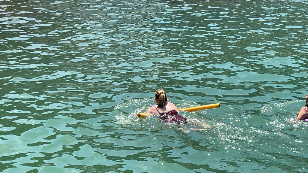 There’s a nice swimming pool so after checking out our digs we go for a dip….it’s cold – just want we need and feels great.
