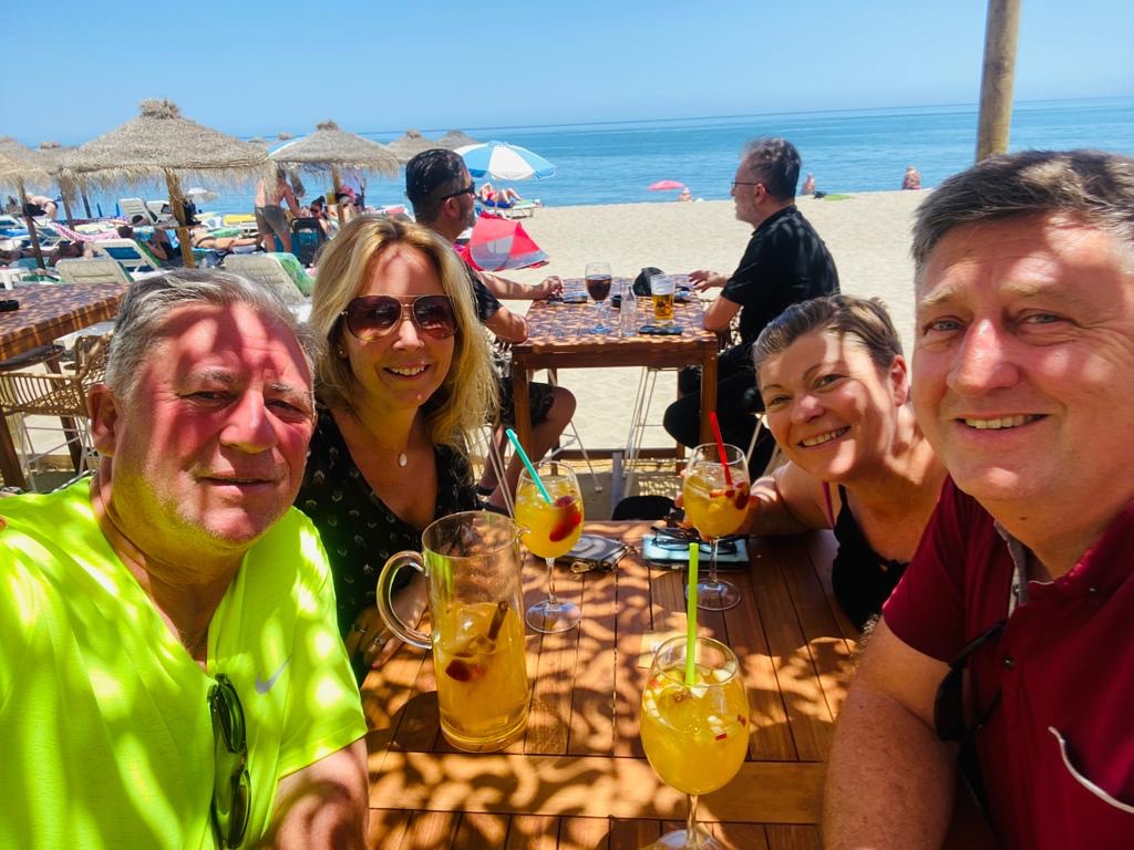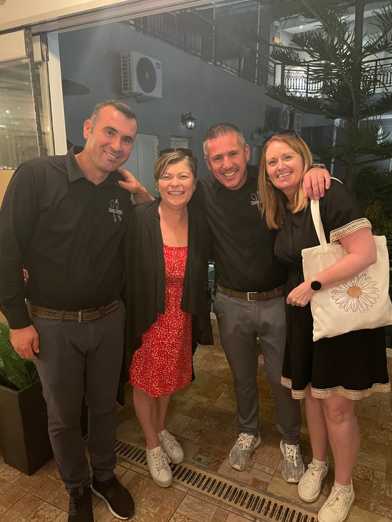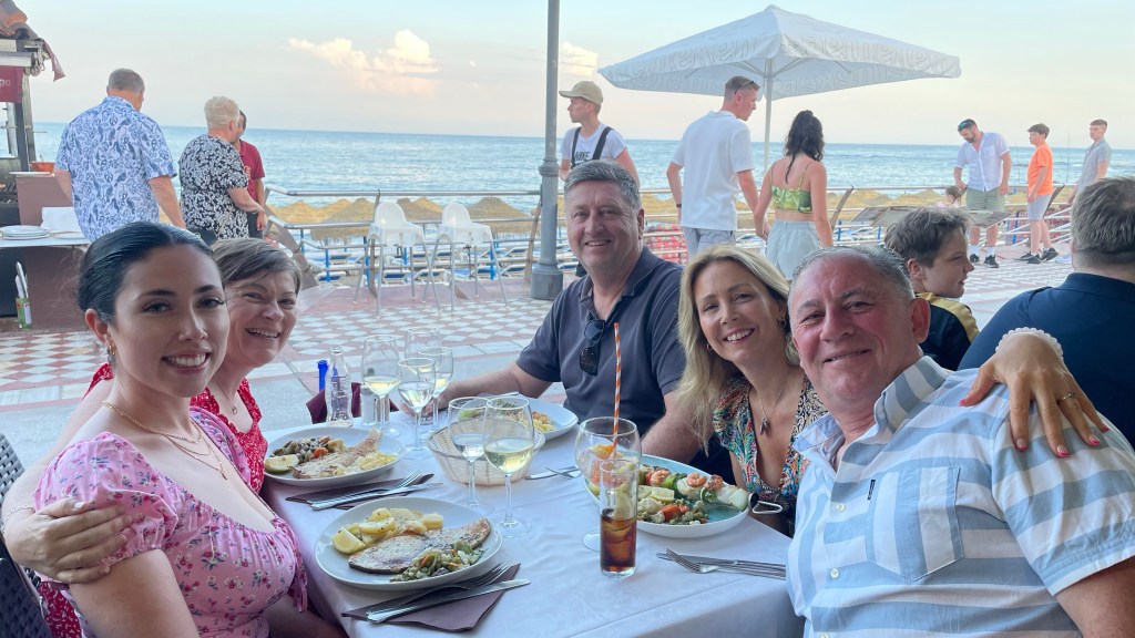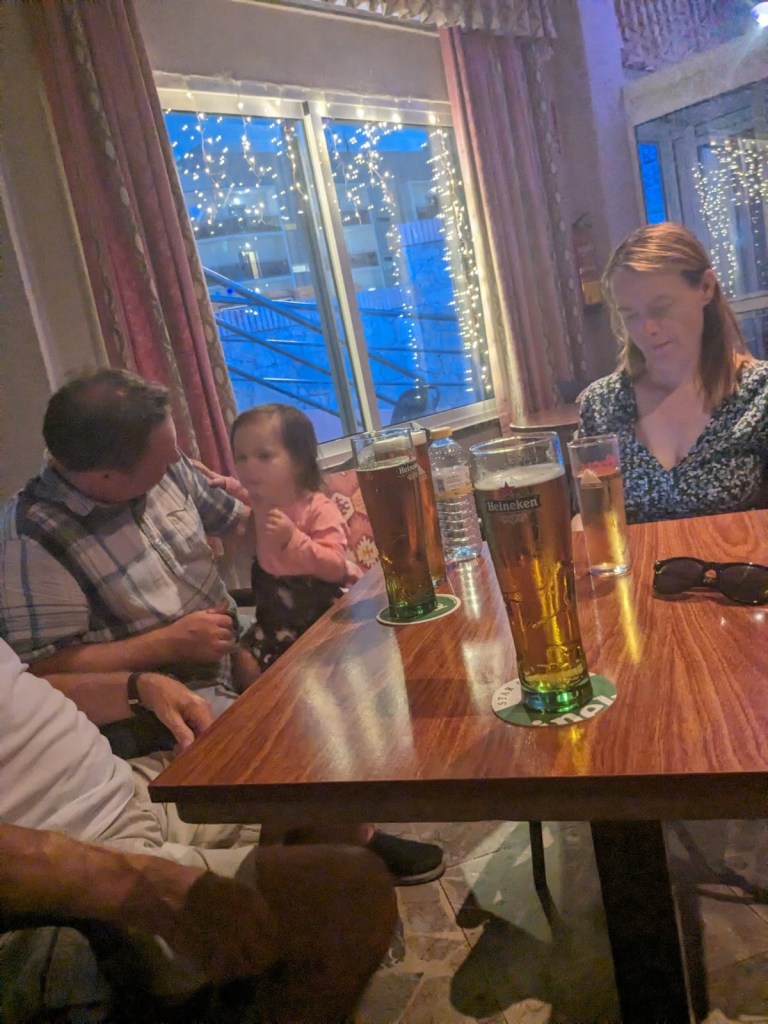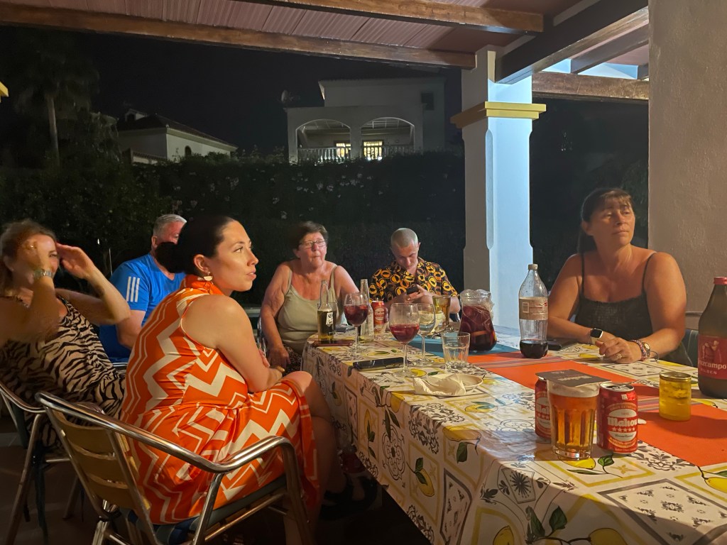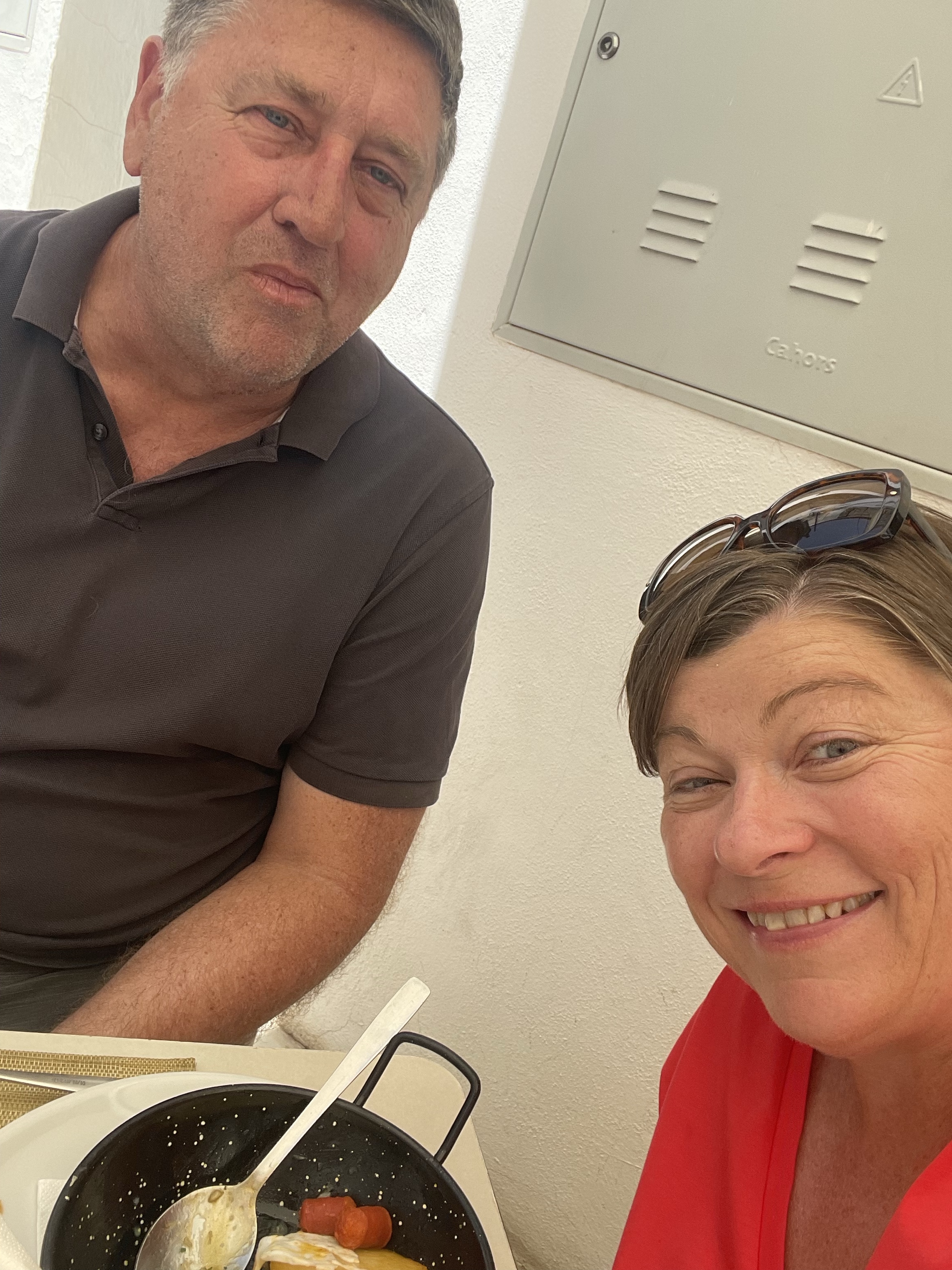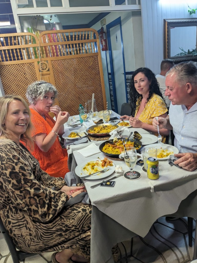 We have a drink upstairs on the terrace – a very nice white wine and San Miguel for the boys – that’s all they’ve got!! A first selfie with the gang back together before we move downstairs for dinner.