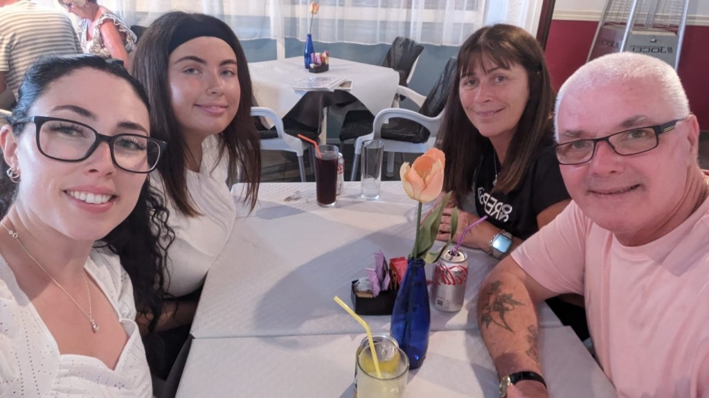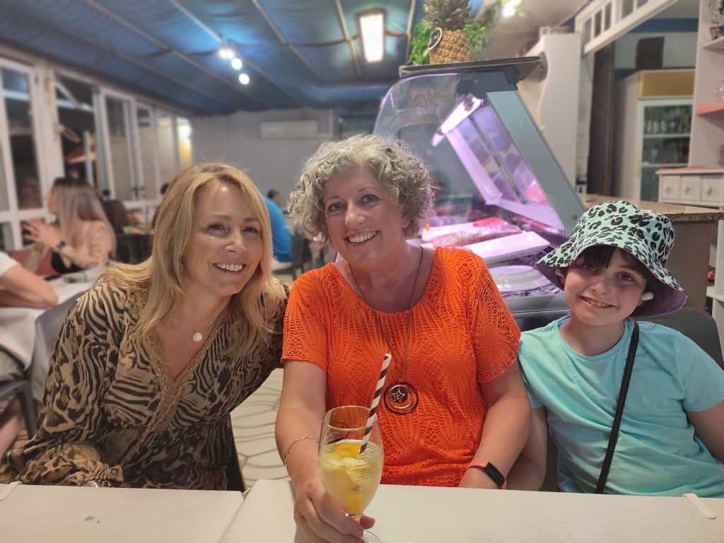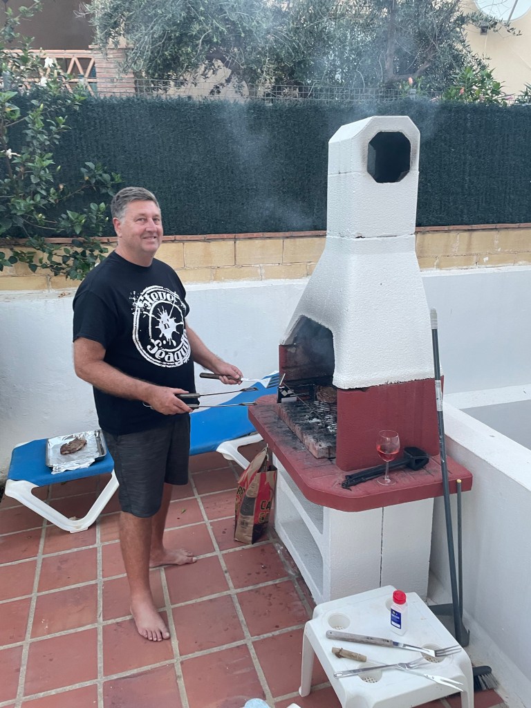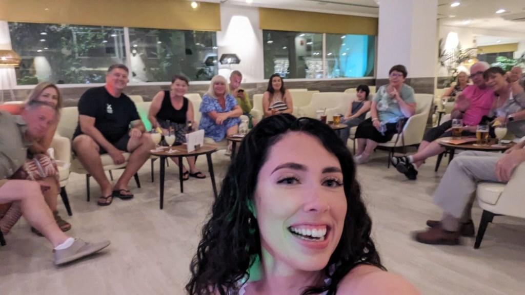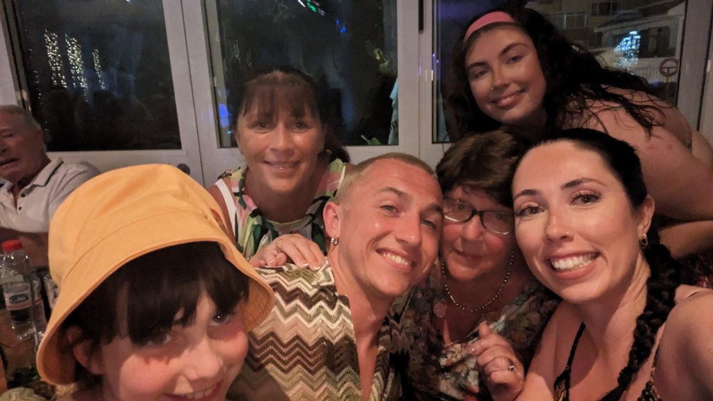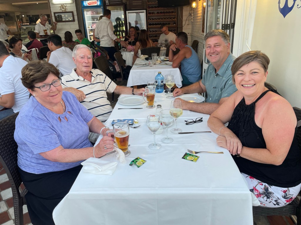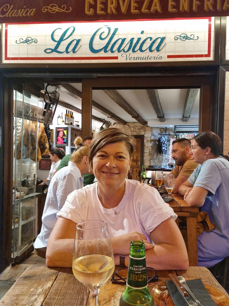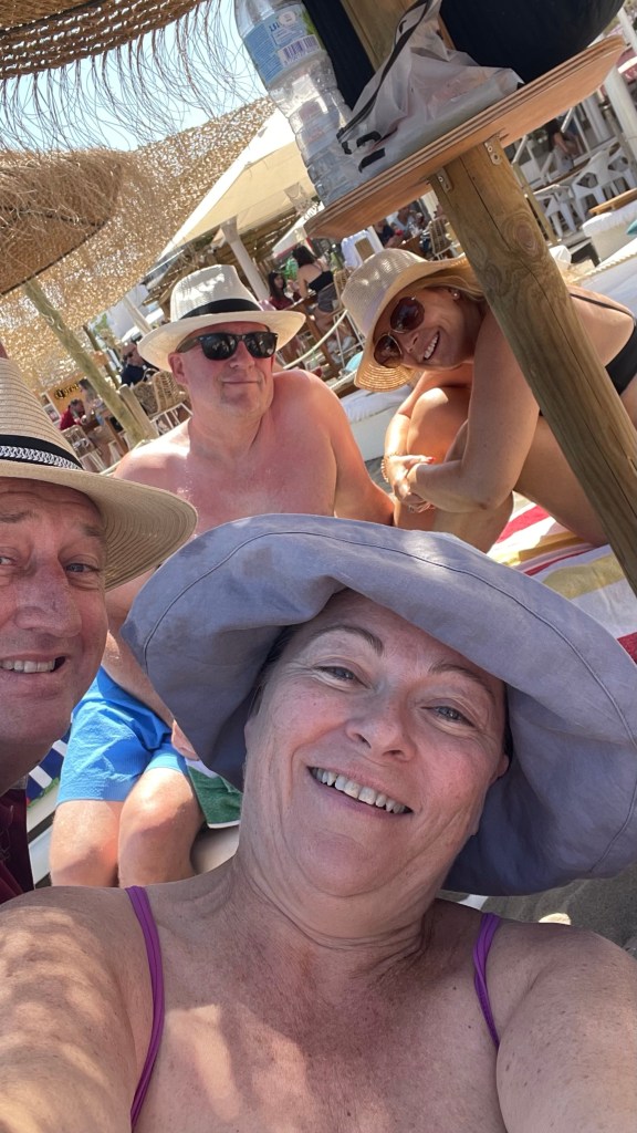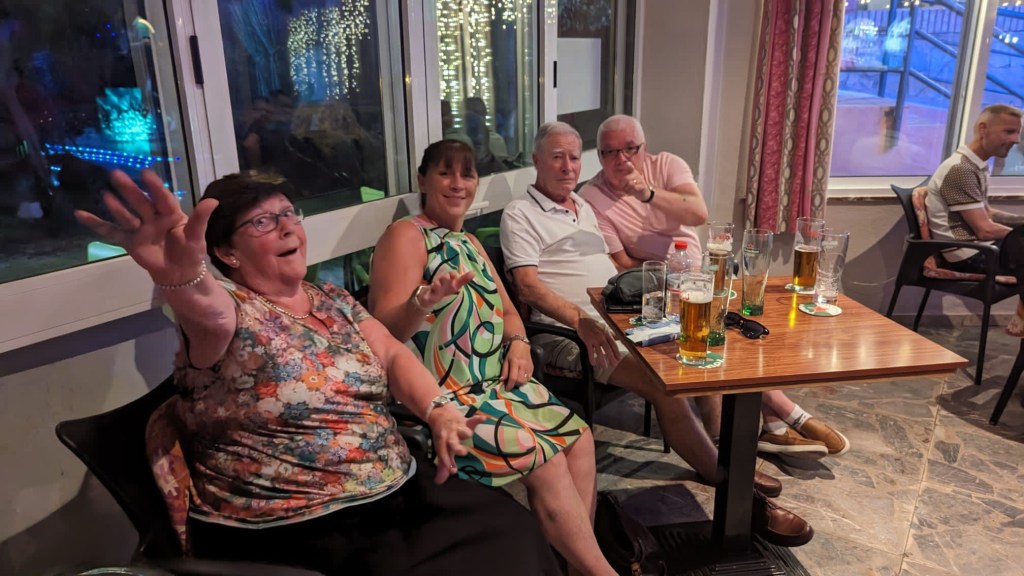 We have a drink upstairs on the terrace – a very nice white wine and San Miguel for the boys – that’s all they’ve got!! A first selfie with the gang back together before we move downstairs for dinner.