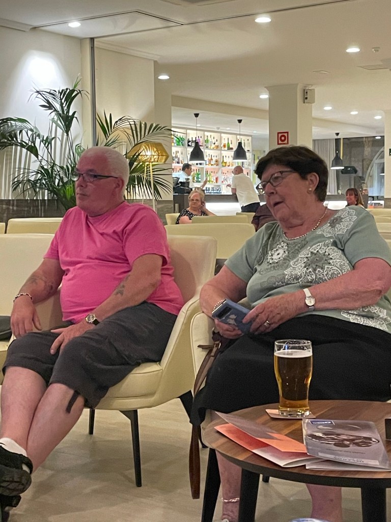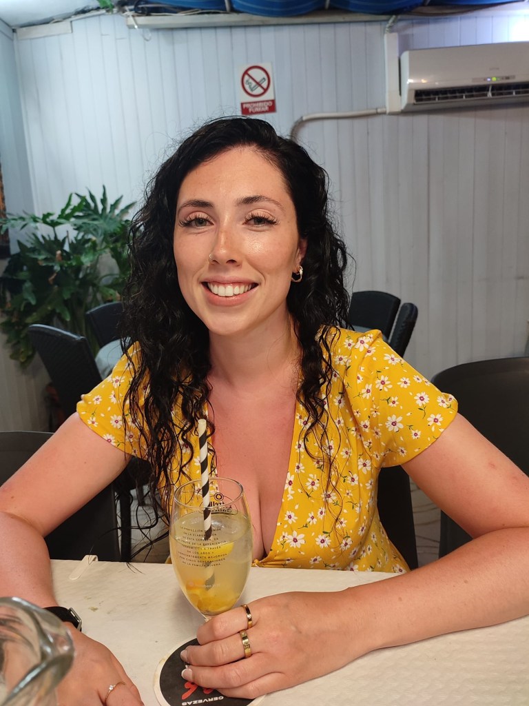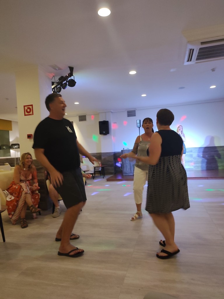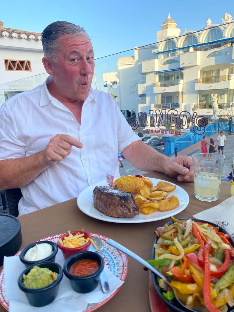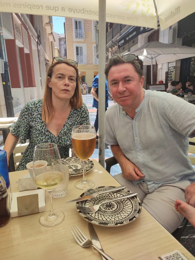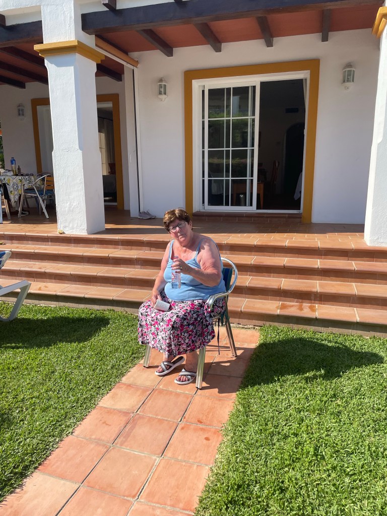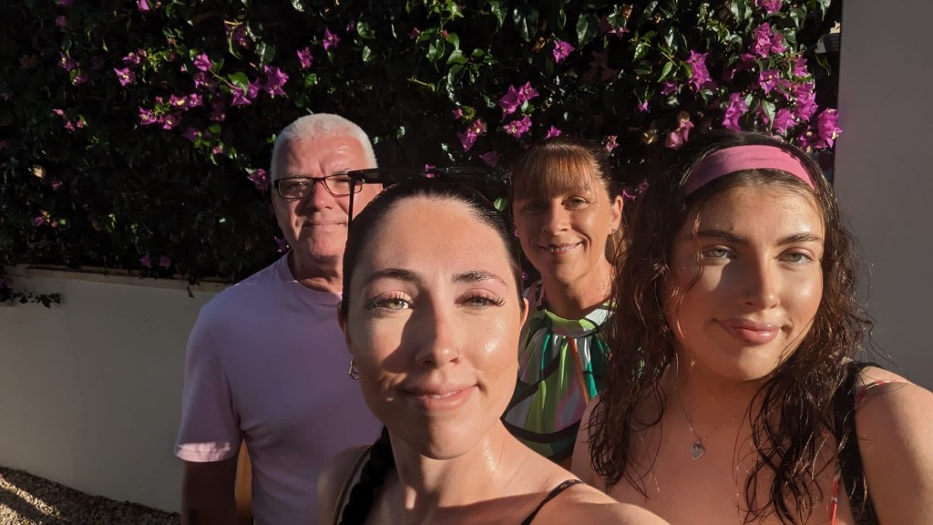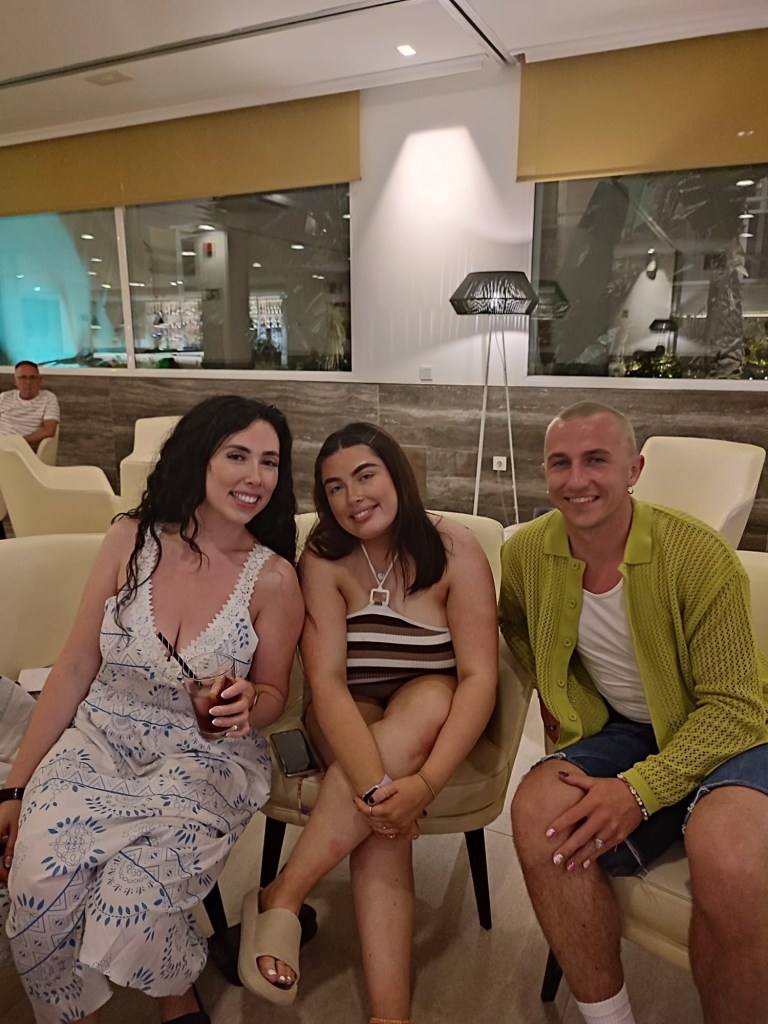 We have a drink upstairs on the terrace – a very nice white wine and San Miguel for the boys – that’s all they’ve got!! A first selfie with the gang back together before we move downstairs for dinner.