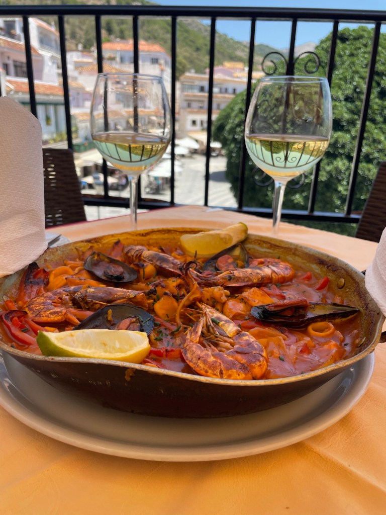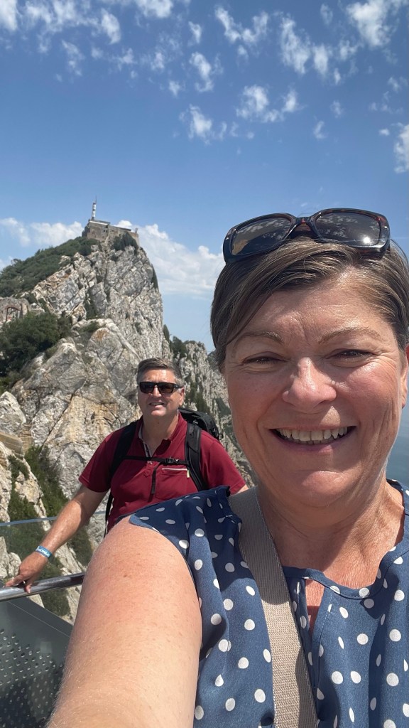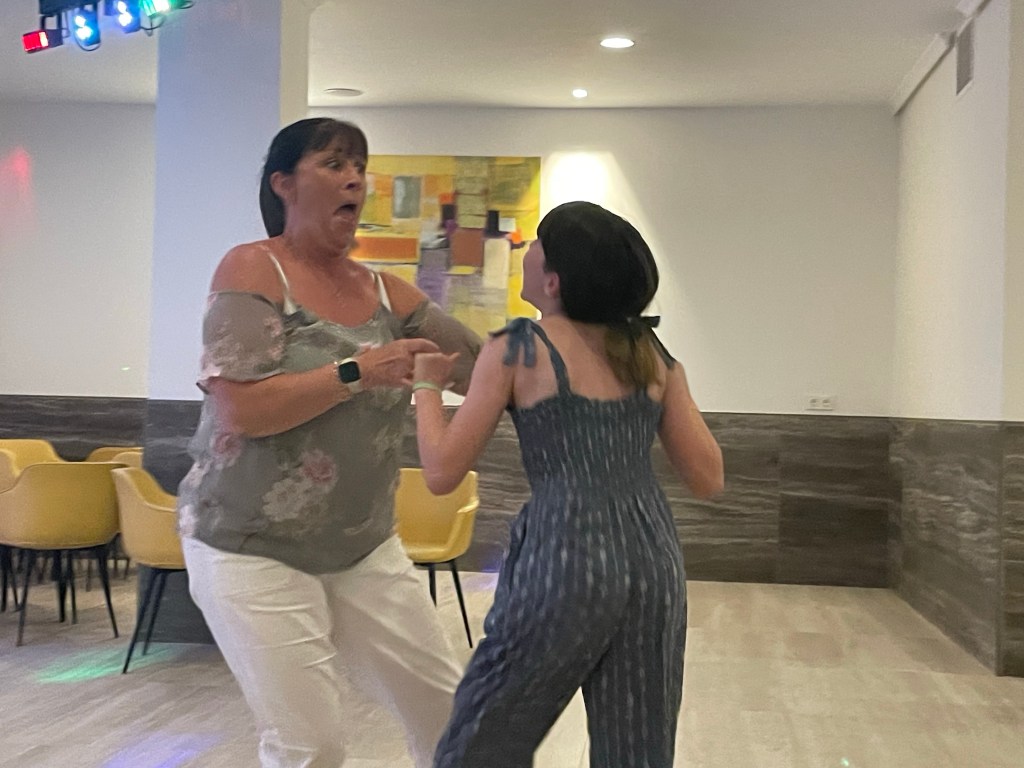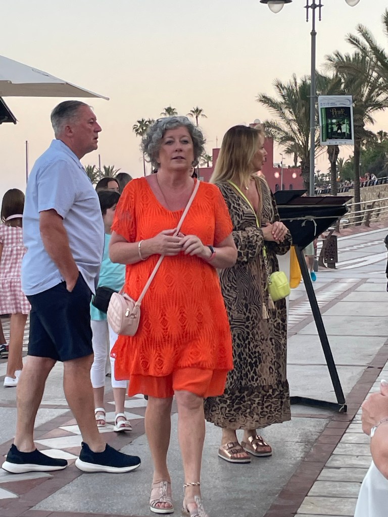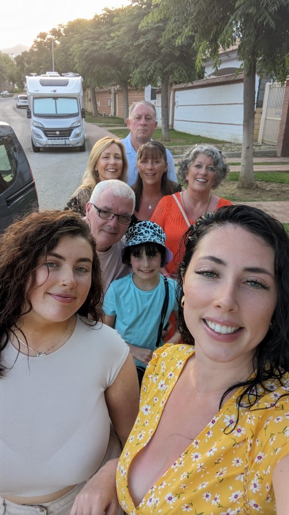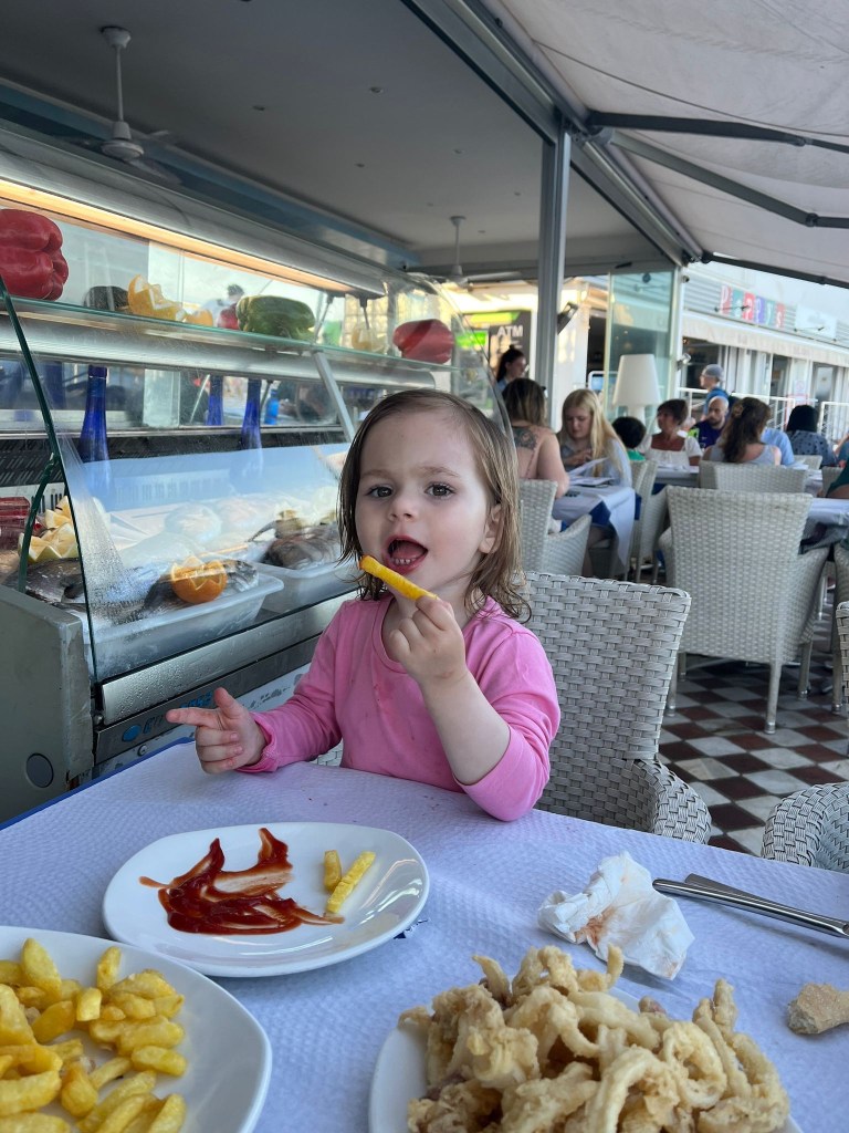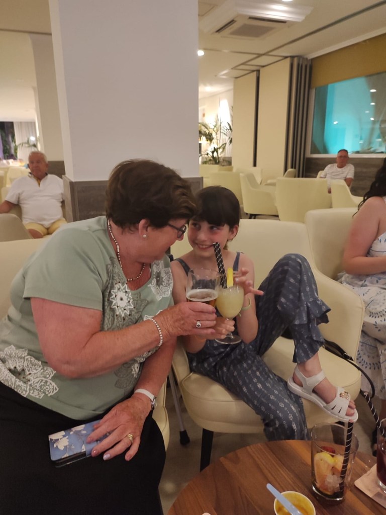 We have a drink upstairs on the terrace – a very nice white wine and San Miguel for the boys – that’s all they’ve got!! A first selfie with the gang back together before we move downstairs for dinner.