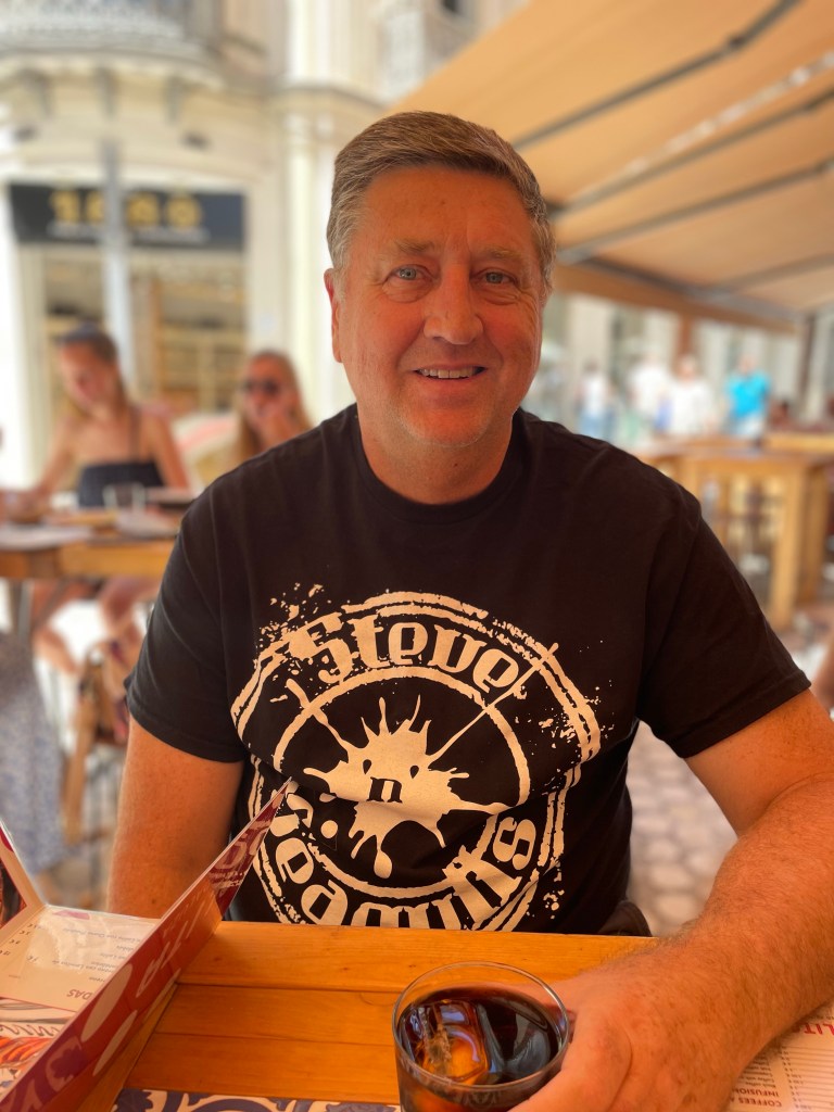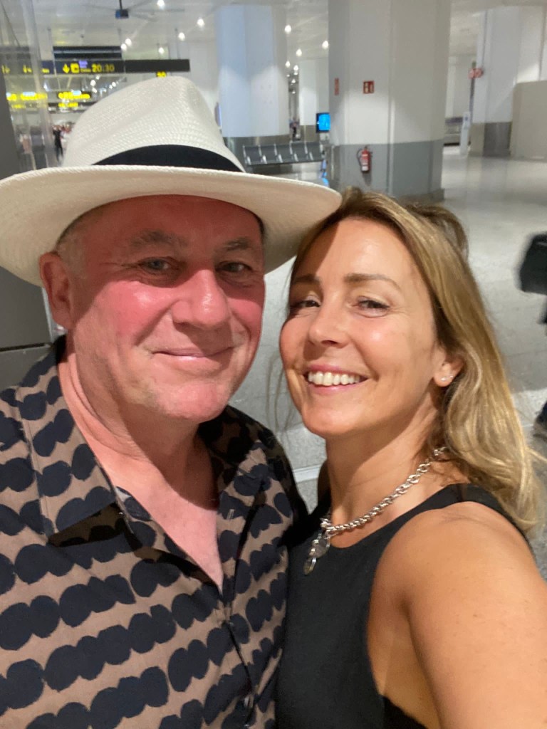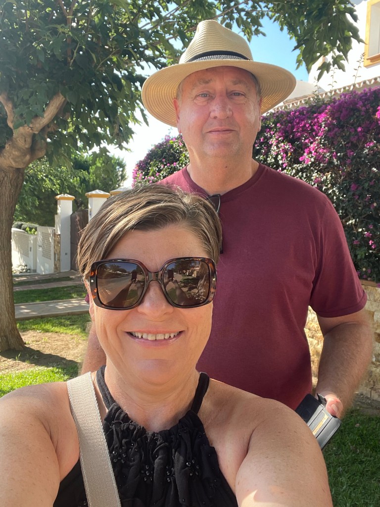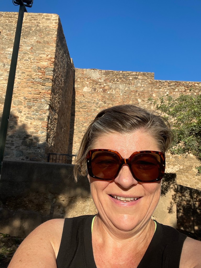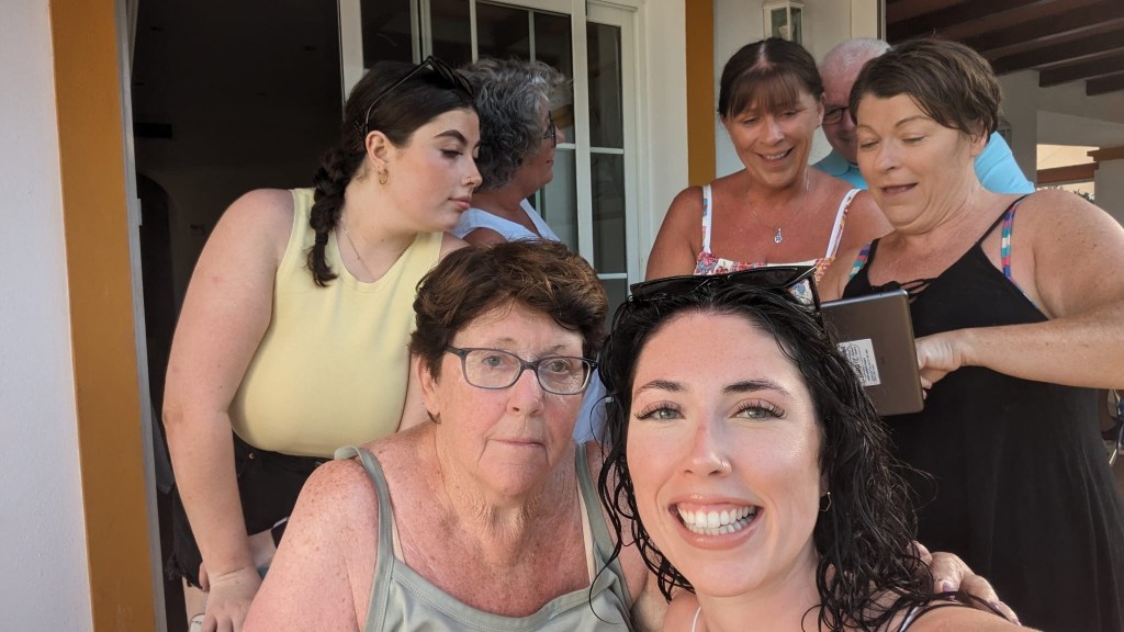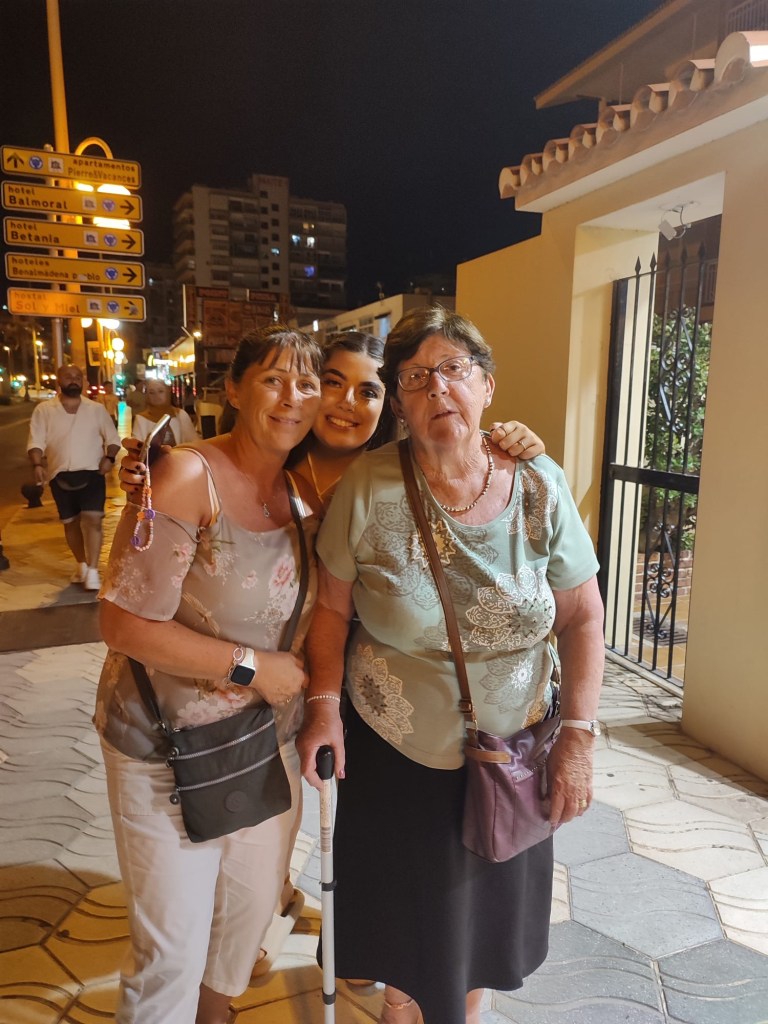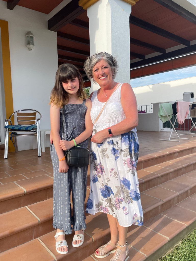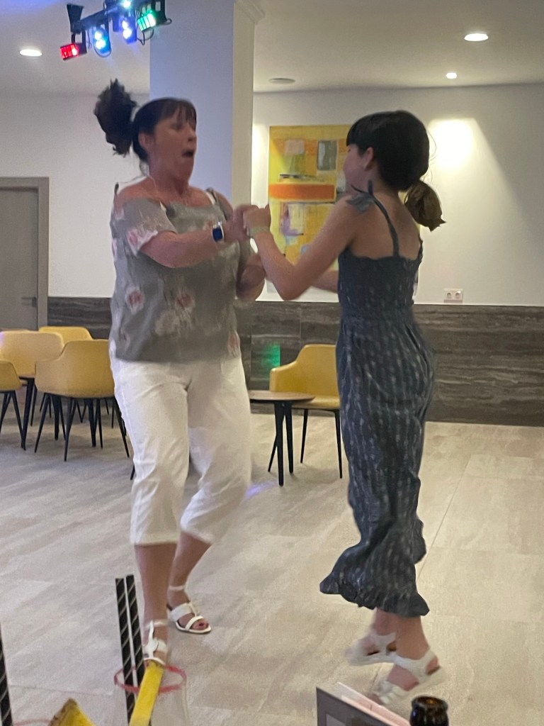 We have a drink upstairs on the terrace – a very nice white wine and San Miguel for the boys – that’s all they’ve got!! A first selfie with the gang back together before we move downstairs for dinner.