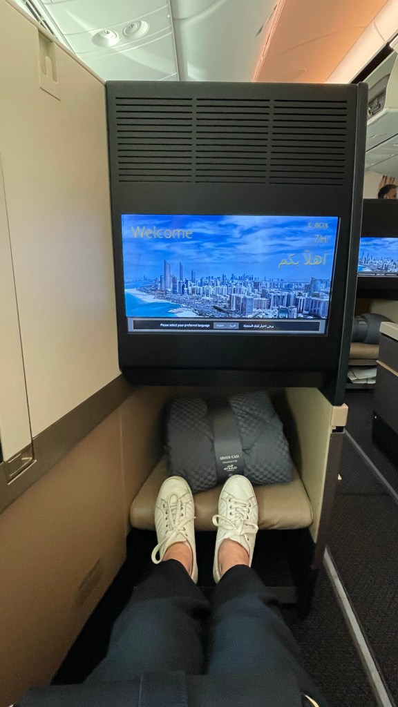Business class on Etihad is really comfortable and I have one of the best meals I have ever had on a plane.