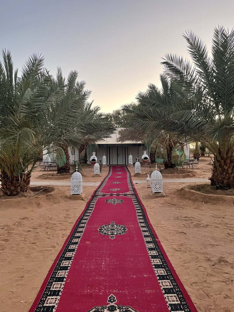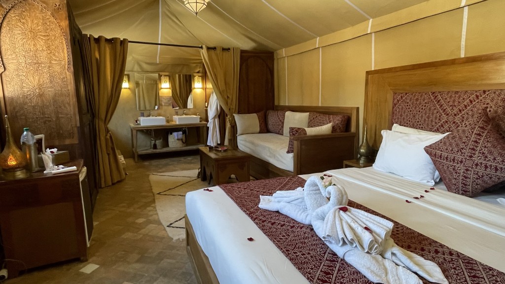 The luxury campsite is impressive with each “room” containing a queen bed plus two single beds – it’s huge!! There’s a dining tent where we have a very nice 4 course meal of cauliflower soup, salad with goats cheese, an odd main considering we’re in the desert (chicken and mushroom, veg and tomato covered in creamy sauce), finished off with crème brûlée. We have a bottle of wine we saved from last night so get one decent glass each. After dinner there’s some local music which is essentially drums and what seems like repetitive roaring and shouting… we call it a day and enjoy the reduction in temperature as we head back to the tent.