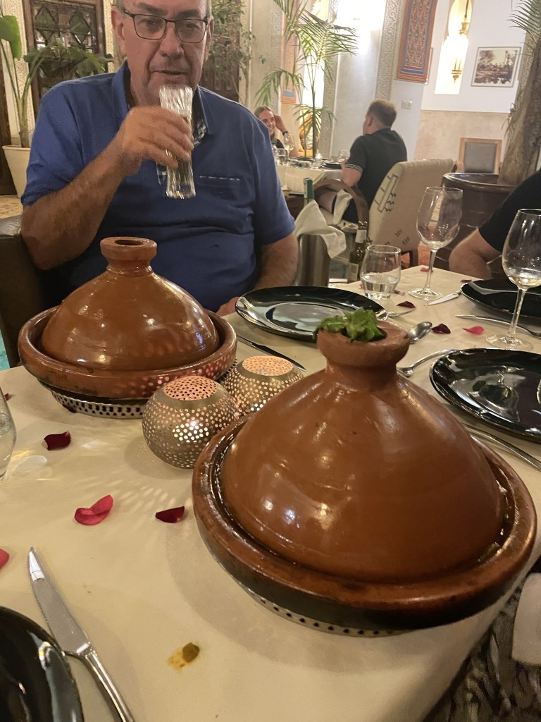 We have two different starters, one is tomato based, the other aubergine. I’m not sure how to describe them, suffice it to say they are gorgeous. Then onto the mains which are served in tagines (of course!), one a lamb dish with apricot and prunes, the other chicken with vegetables. It‘s all served with bread and of course the obligatory olives. We finish our meal with a chocolate mouse and they have black tea with milk so I’m happy out!