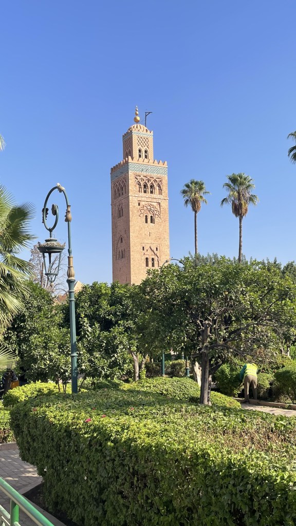 Our guide arrives and we are off to our first stop – Koutoubia mosque. This is the largest mosque in Marrakech and can accommodate 20,000 faithful! The area outside is closed off due to the recent earthquake, although we cannot see any visible damage. Friday is the busiest day as everyone goes to the mosque to pray.