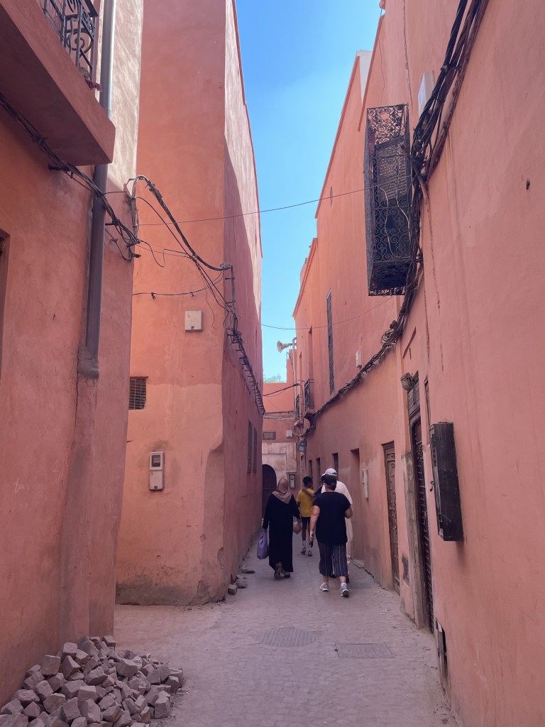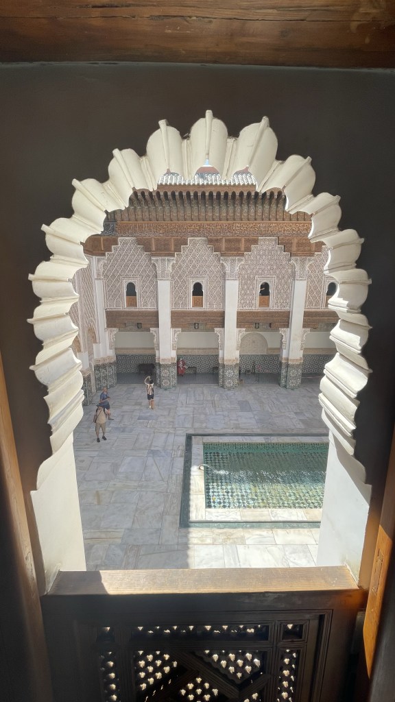 We are supposed to visit the beautiful El Bahia Palace but it’s closed due to some clean up needed after the earthquake so instead we visit Ben Youssef Medrasa. A medrasa is an Islamic school or Qur’anic school. This one dates back to the 14th century and is no longer in operation but had 900 students at any one time.