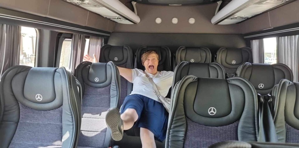 We’re not quite sure what vehicle to expect and having seen some six seater vans earlier are thinking it might be a bit of a squeeze but when we’re brought to our “van” we’re very pleasantly surprised. It is a beautiful brand new Mercedes that seats 15 people in addition to the guide and driver.