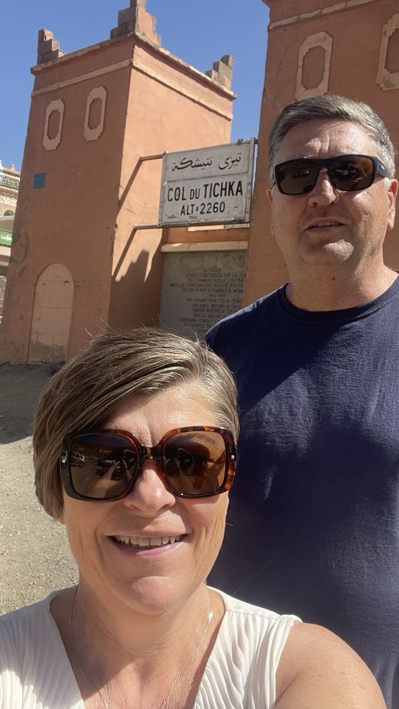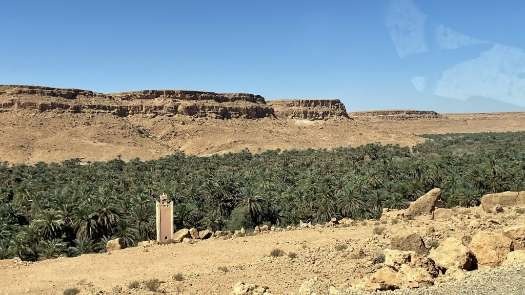 After another delicious breakfast which always includes a big glass of freshly squeezed orange juice, it’s all aboard the bus as we set out for Fez with a few stops along the way. We are ascending over the Atlas Mountains driving along the Ziz valley with its giant palm trees.