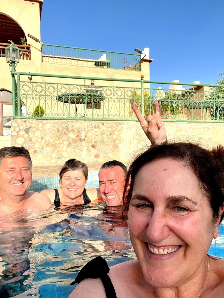 Looks like the flight is on time, so we’ll head back to the riad to rest our feet and anticipate their arrival! They arrive around 4 pm and I greet them with my feet in the water! We decide to eat at the riad tonight and they told us they will surprise us with the menu.