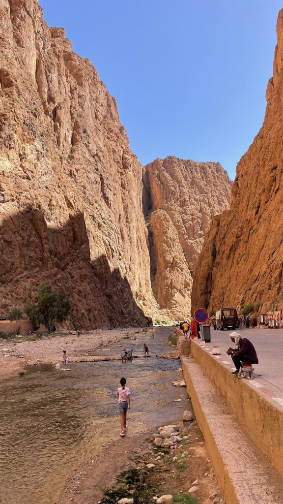 Onwards to the Todra Gorge….. As we drive the winding road there is beautiful scenery around every corner. Lush palm groves and old kasbahs with the cliff backdrop. It’s stunning.