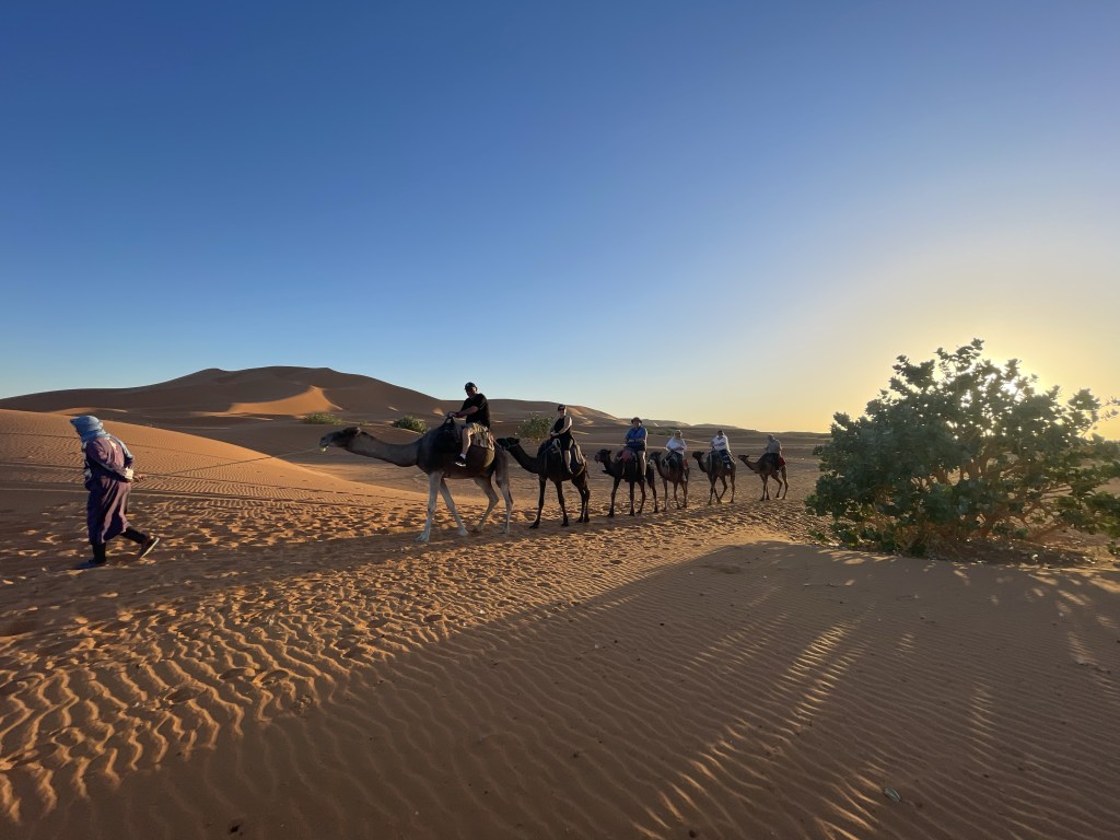 We see giant sand dunes on the horizon – we have arrived!! These dunes are the Erg Chebbi dunes in Merzouga’s Sahara desert.