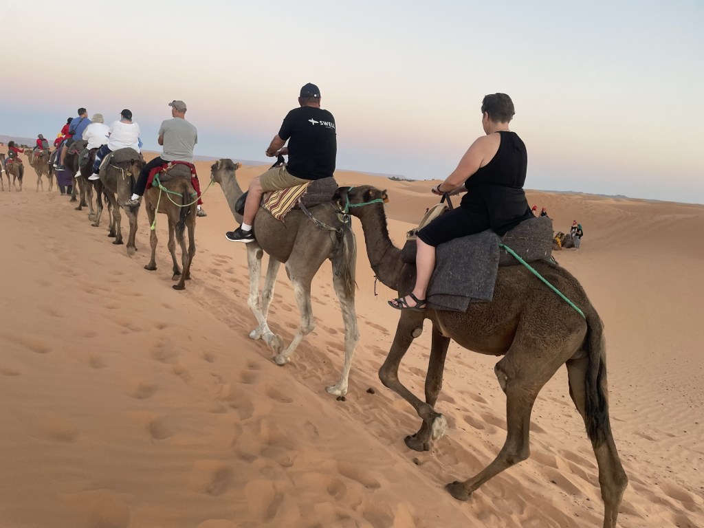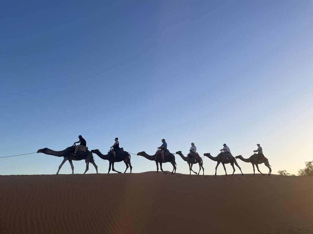 We all manage to get up successfully and we set off across the dunes. It’s a bit nerve wracking initially but they’re fairly stable and it’s quite enjoyable once I loosen the death grip on the saddle! Fatima, Couscous, Ali Baba…. Let’s go!!