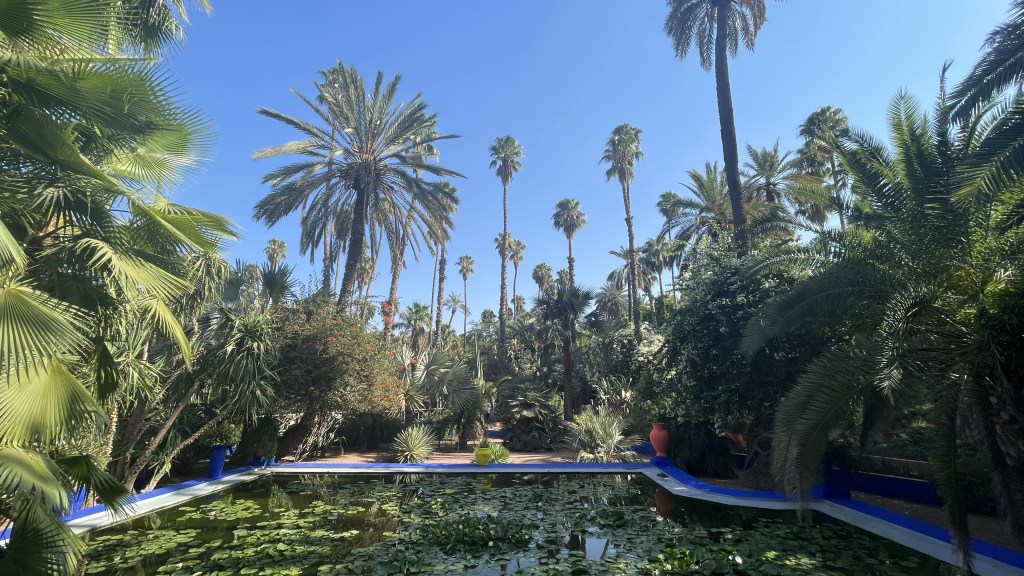 Majorelle gardens are next on the tour. Jacques Majorelle who settled in Marrakech and ended up designing much of the new city (we have mostly been in the medina which is the old city) built these beautiful gardens and placed a striking blue building at their centre.